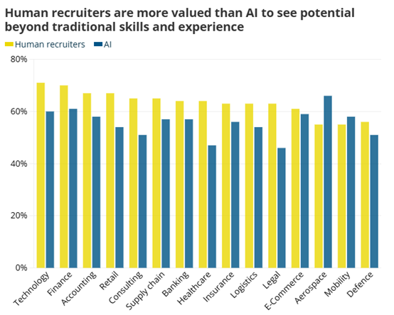 圖1:在人類技能與經驗之外看見潛力這件事上,人類招聘者比AI更被重視